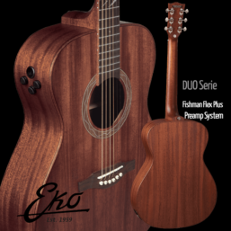 Die DUO A200e ist die elektrifizierte Akustikgitarre von Eko Guitars mit eingebautem Fishman Flex Plus T System. Ausgestattet mit einer Auditorium-Form mit Mahagoni-Massivdecke, Mahagoni-Boden und -Zargen, Mahagoni-Hals und südamerikanischem Roupana-Griffbrett, ist dieses Instrument sowohl für den Amateur-Gitarristen als auch für den Profi geeignet, der Live-Auftritte und Studioaufnahmen macht.