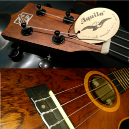 Die Ukulele ist mit unserem Logo versehen und mit Aquila Super Nylgut besaitet.