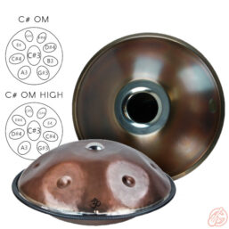 Beide hier gezeigten Stimmungen beruhen auf der C#-Moll-, bzw. C#-Kurd-Skala. Die C#-Om Stimmung entspricht der klassischen Kurd-Stimmung bei 440Hz-Handpans und bietet im unteren Tonbereich viele harmonische Möglichkeiten, während die Om-High Variante auf die kleine Septime (B3) verzichtet und stattdessen die zweite Oktave (C#5) beinhaltet und somit im hohen Bereich mehr melodiöse Akzente ermöglicht. Andere Stimmungen, etwa C# Om Dur, auch auf Anfrage erhältlich!