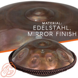 Die Handpan ist die perfekte Kombination aus Percussion- und Melodieinstrument. Sie besteht aus zwei dünnen, zusammengesetzten Edelstahlschüsseln. Im Rahmen ihres Herstellungsprozesses werden die Hälften per Hand aufwändig gehämmert. Dabei entstehen Dellen und ein kleiner Hügel in der Mitte des Korpus. Diese Flächen bilden die verschiedenen Klangfelder. Umgeben von einem Kreis mit 8 Tönen liegt in der Mitte der Handpan die Zentralnote. Auf der Unterseite dieser Handpan liegen noch 4 weitere Tonfelder Werden die Felder angespielt, entstehen helle, langanhaltende Klänge.