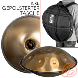 Die Handpan ist die perfekte Kombination aus Percussion- und Melodieinstrument. Sie besteht aus zwei dünnen, zusammengesetzten Edelstahlschüsseln. Im Rahmen ihres Herstellungsprozesses werden die Hälften per Hand aufwändig gehämmert. Dabei entstehen Dellen und ein kleiner Hügel in der Mitte des Korpus. Diese Flächen bilden die verschiedenen Klangfelder. Umgeben von einem Kreis mit 8 Tönen liegt in der Mitte der Handpan die Zentralnote. Werden die Felder angespielt, entstehen helle, langanhaltende Klänge.