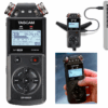 - Stromversorgung mittels dreier Alkaline-Batterien oder NiMH-Akkus (Größe AA), USB oder optionalem Wechselstromadapter (Tascam PS-P520E); bis zu 15 Stunden Laufzeit im Batteriebetrieb bei ausgeschalteter Phantomspeisung