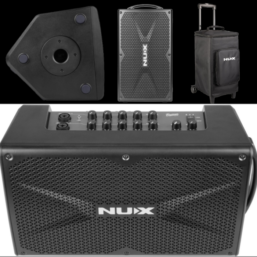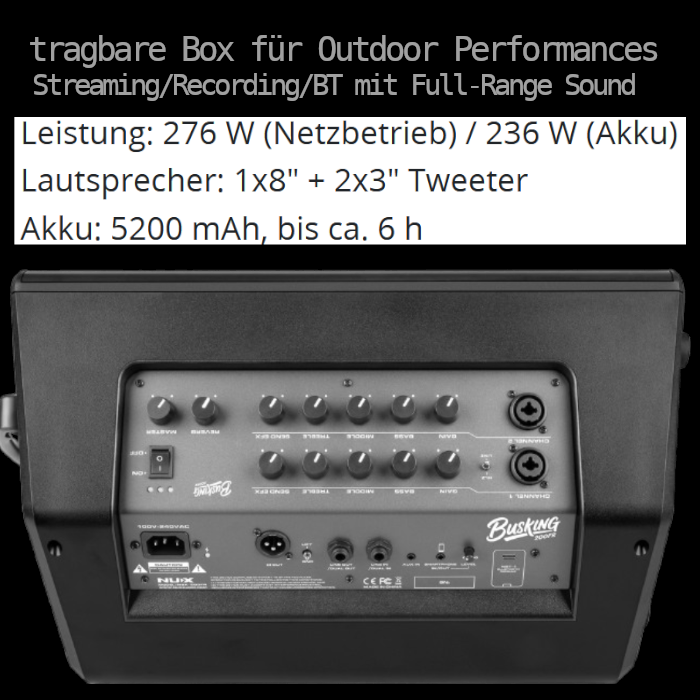 Der NUX Busking 200FR ist eine tragbare FRFR-Box für Outdoor-Performances, die Portabilität mit Full-Range/Flat-Response-Sound und ordentlich Leistung verbindet. Das ABS-Gehäuse hält das Gewicht niedrig, während die Bestückung aus 1×8″ Full-Range plus 2×3″ Tweeter und eine Class-D Endstufe bis 276 W (Netzbetrieb) liefern.