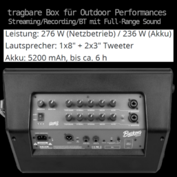 Für den Einsatz ohne Steckdose ist ein Lithium-Akku integriert (5200 mAh) mit bis zu ca. 6 Stunden Laufzeit. Außerdem gibt’s zwei komplett analoge Eingangskanäle mit eigener EQ-Regelung plus Digital-Reverb sowie Live-Streaming und internes Recording per Mobilgerät.